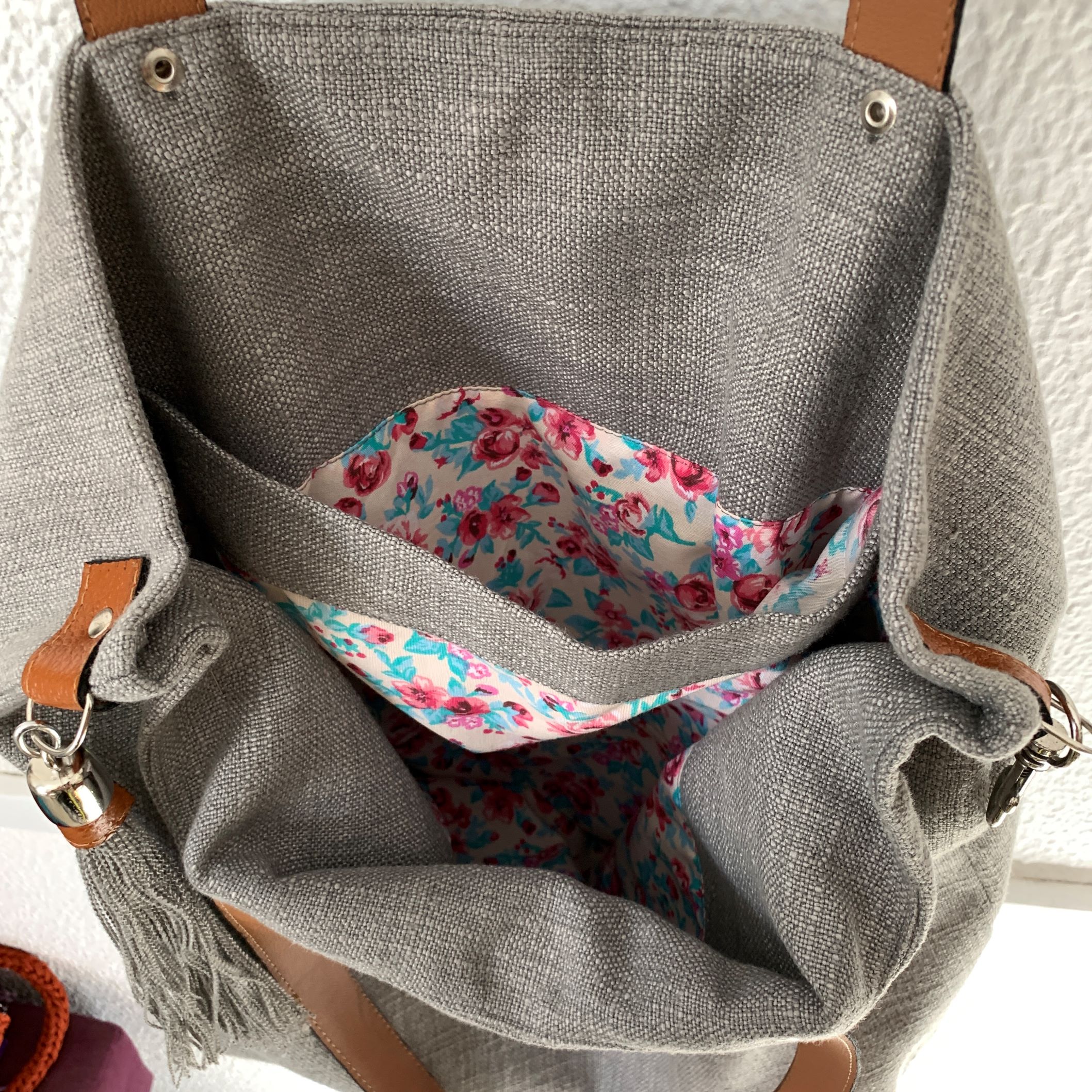 Esta bolsa, em um elegante tom de cinza escuro, é a combinação perfeita de estilo e funcionalidade. Forrada com algodão estampado e equipada com um bolso interno, ela oferece organização e um toque de charme a cada uso.