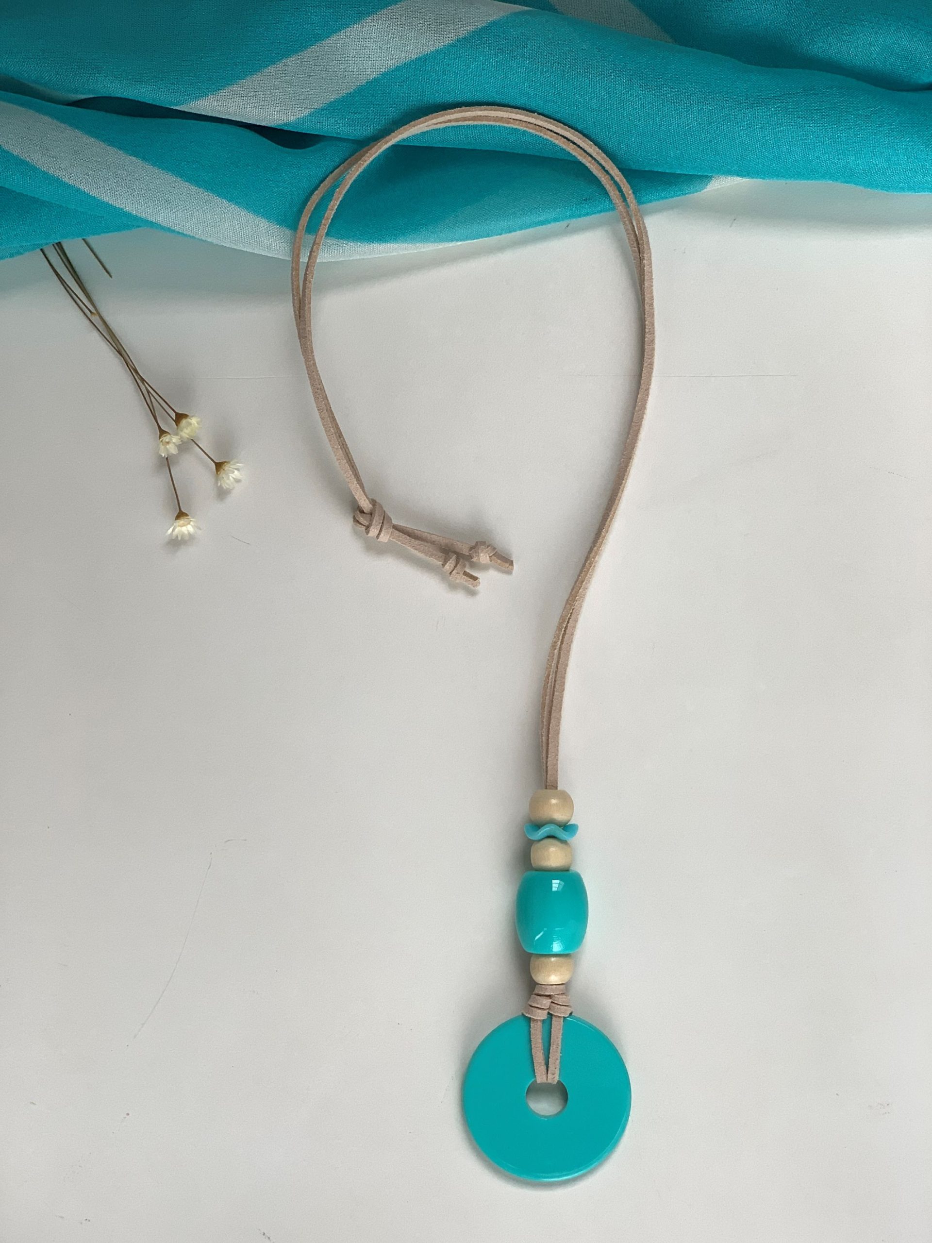 Colar médio fio nobuck bege com 3 resinas turquesa(1redonda com furo no centro e 1 barril peq. + 2 ondulada) + 3 miçangas de madeira cor natural.