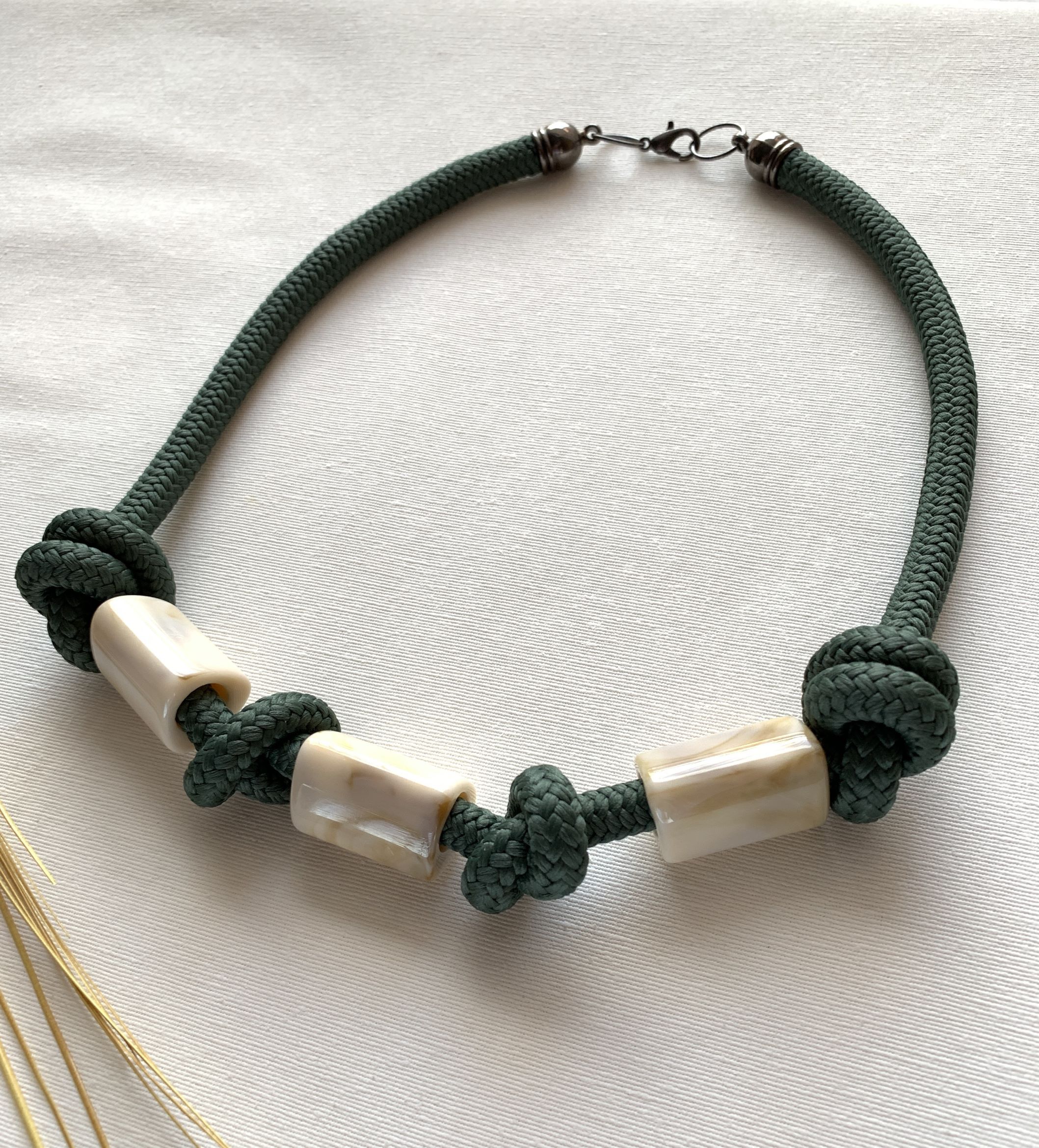 Colar curto corda náutica grossa verde militar com 4 nós e 3 resinas triangulares creme maleado.