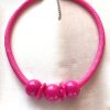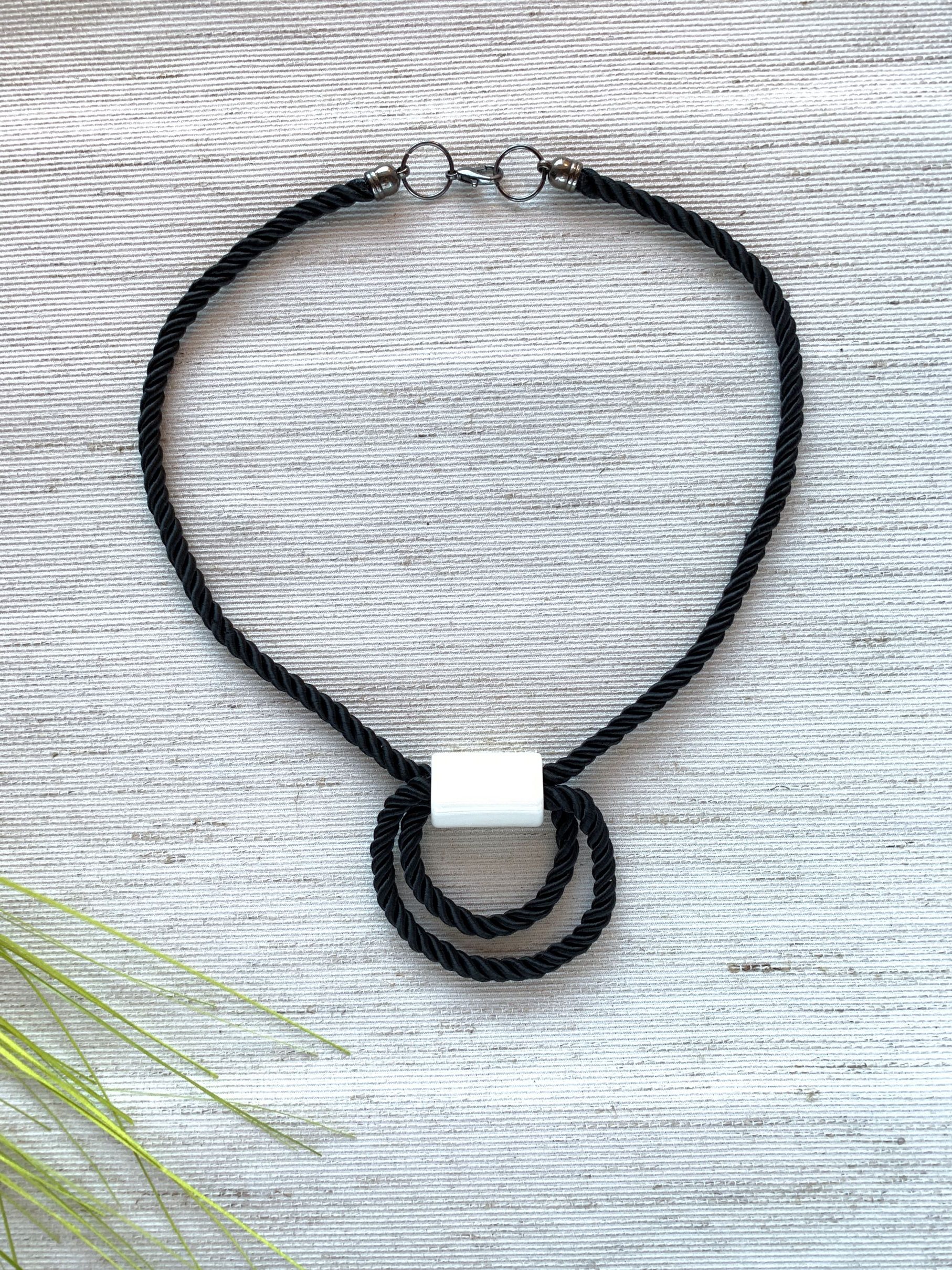 Colar curto de 1 volta de fio de seda trançado preto com 2 anéis do mesmo fio preso com 1 resina branca.