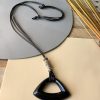 Colar curto em cabo tricô na cor cinza com duas voltas, decorado com um pingente em resina na cor verde turquesa suspensa por um cabresto prateado, e na linha de cima duas resinas verde turquesa de cada lado. O fechamento é feito com tulipas prateada.