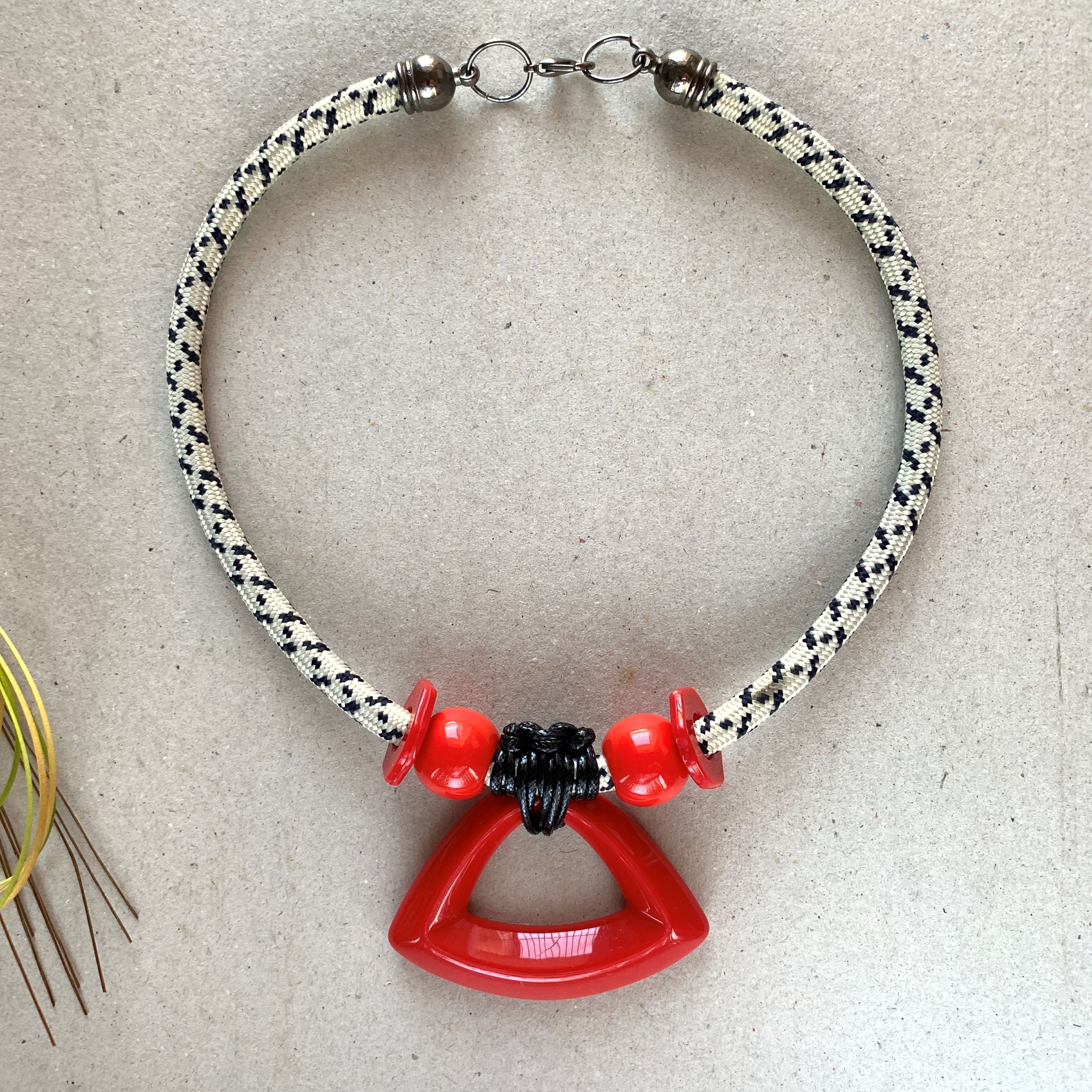 Colar curto em corda náutica branca com detalhes em preto, decorado com cinco resinas na cor vermelho cereja sendo, no centro um triângulo grande fixado com nó decorativo em fio encerado preto e duas de cada lado. Fechamento do colar na cor pratapreta.