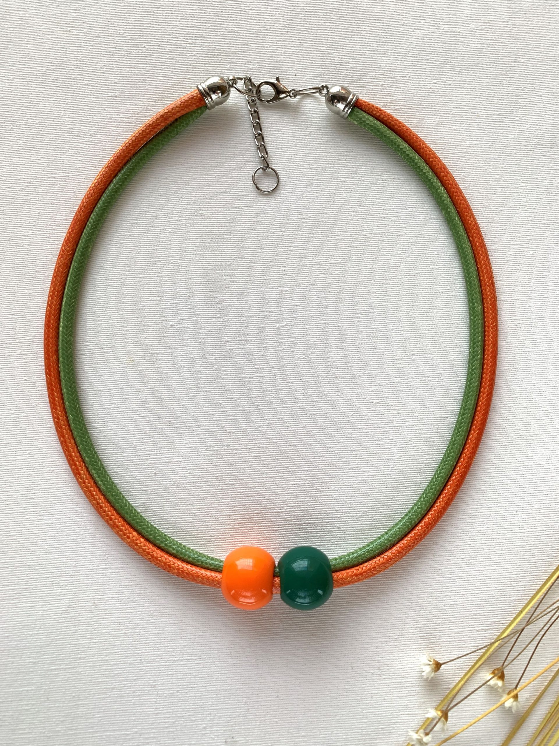 Adicione um toque de cor ao seu look com este colar curto em fio encerado grosso. Com duas voltas, uma em verde maçã e a outra em laranja, ele traz uma vibração alegre e moderna. As resinas em formato de bola, nas mesmas cores, dão um charme extra à peça.